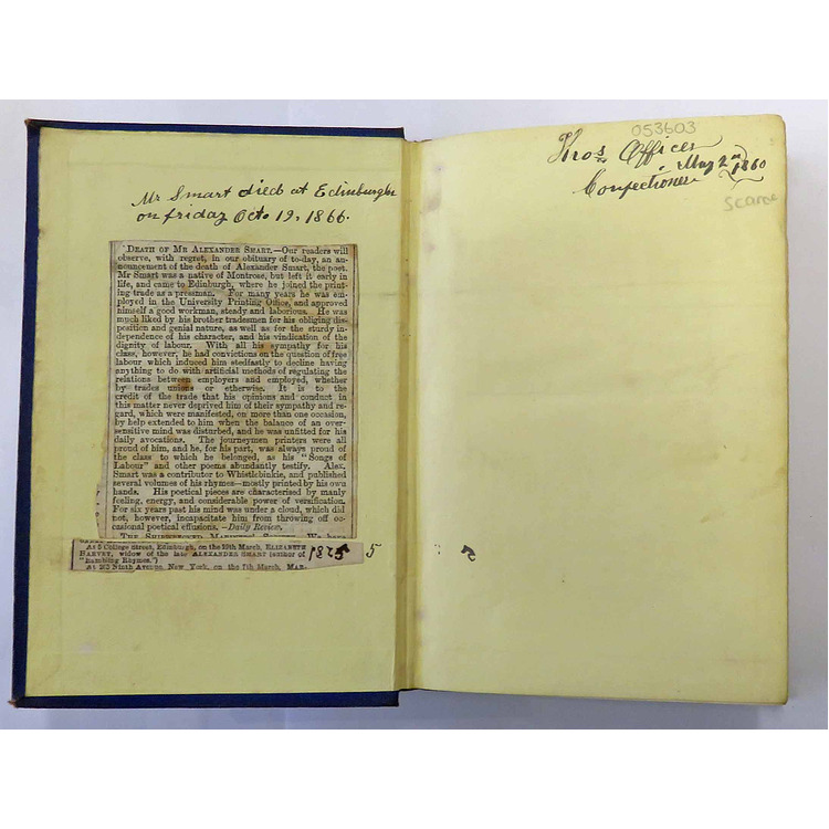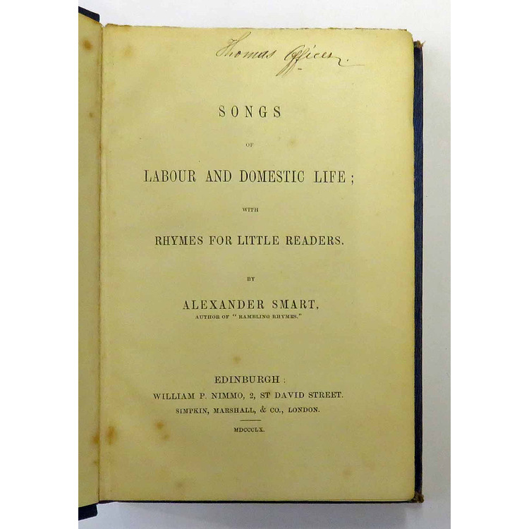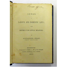 279 pp. Bound in blue cloth with blind stamp decoration to upper and lower boards. Gilt lettering to spine. Previous owner's inscription to front free end paper. A newspaper obituary for the author has been stuck to the front paste down end paper by a previous owner. "Mr Smart died at Edinburgh on Friday October 19, 1866" has been written above the obituary. The obituary for A.Smart's wife has also been stuck in. Light rubbing to boards and hinge, edges and corners a little bumped. Still bright, overall very good condition. Scarce title.
