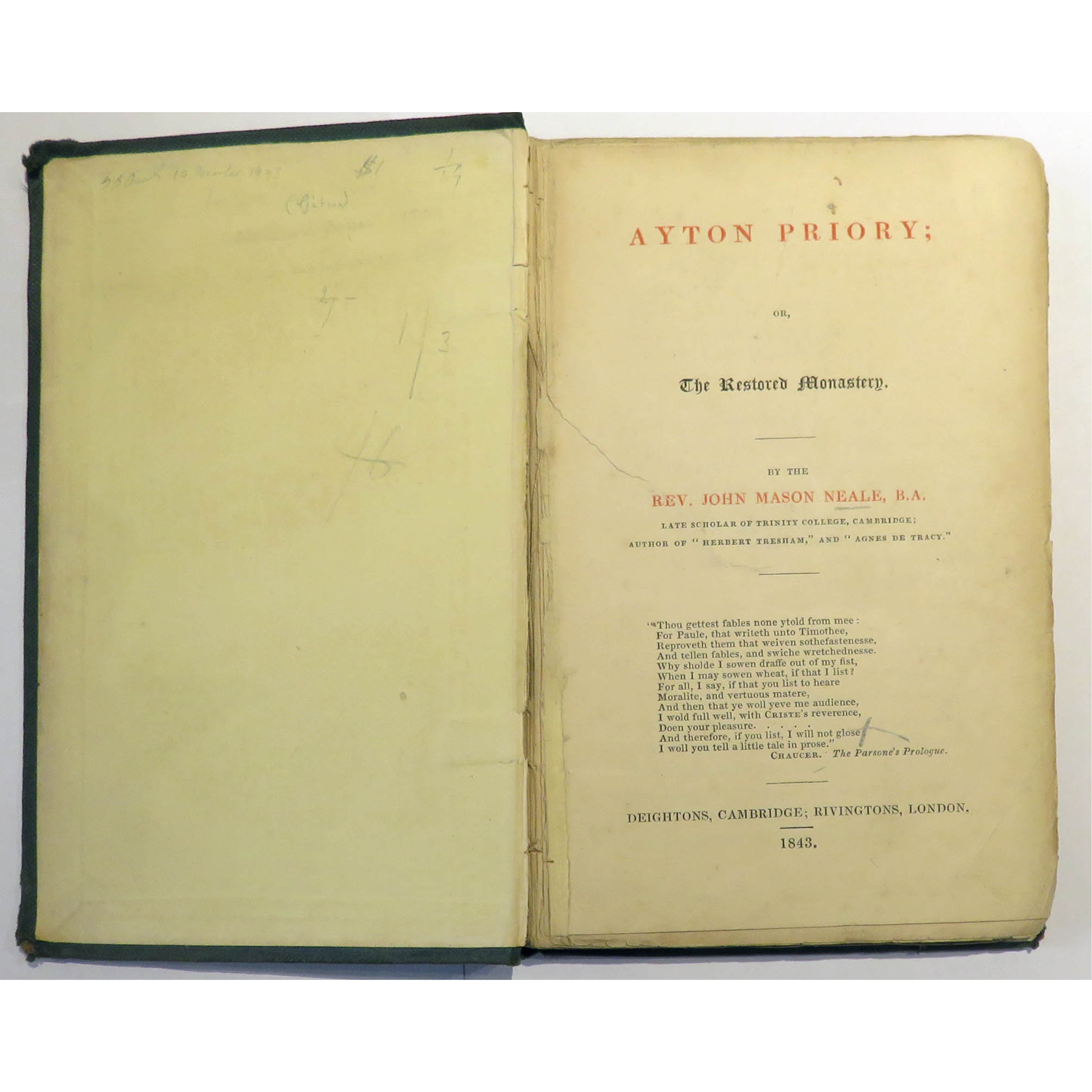 Hardback, dated 1843 first edition. Scarce. Bound in the publishers' original green cloth with decorative green embossing to the front and rear boards and gilt titles to the spine. The cloth is a little worn and has slightly discoloured in places, the cloth has split along the outer hinges of the spine and is a little frayed along the top edge and base. Internally the front free endpaper and possibly the half-title page are missing. The text block is a little loose with the boards although still attached, are slightly pulling away. The first four pages and two rear pages are loose with a closed tear to the title page. There is a small piece missing to the corner of page 7 and a closed tear to the corner of page 9. The remaining pages are slightly toned with the occasional spot of foxing and thumb marks throughout however they are generally clean. pp. viii + 213 + publishers' list. A fragile although interesting little copy. John Mason Neale was an English Anglican priest, scholar and hymn-writer. His most famous hymn is Good King Wenceslas which is set on Boxing Day.